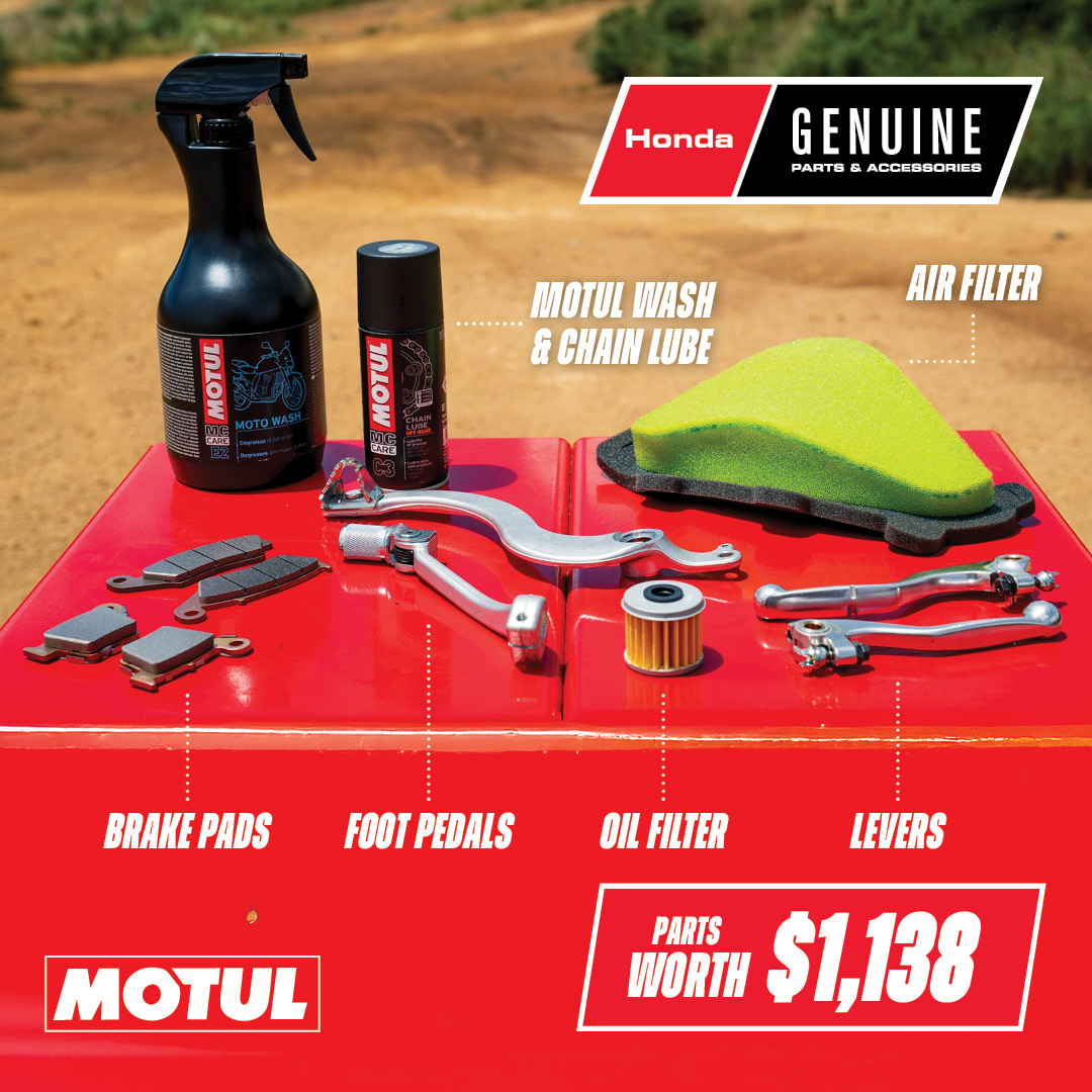 *Pit Pack value is based on the recommended retail price of the included items. Offer available on eligible new 2026 year model CRF450R and CRF450RX models purchased from participating Honda dealers. Limited time only, while stocks last. Offer not available in conjunction with any other offer. Pit Pack contents may vary if an item is unavailable. Standard pit pack includes: a Dirtbuster water blaster (BWDIRTBUSTER); Matrix MX bike stand (BWMXSTAND); Motul Motowash (BWMOTOWASH); Motul chain lube (BWCHAINLUBE); Genuine Honda front (45105MY6415) and rear brake pads (06435MKEAA1); Genuine Honda brake pedal (46510MKEA70); Genuine Honda shift pedal (24700MKEA00); Genuine Honda clutch lever (53180MKEAF1); Genuine Honda brake lever (53171MENJ01); Genuine Honda air filter (17213K95AG0); Genuine Honda oil filter (15412MEN671) and oil filter seal (91302K0G911).